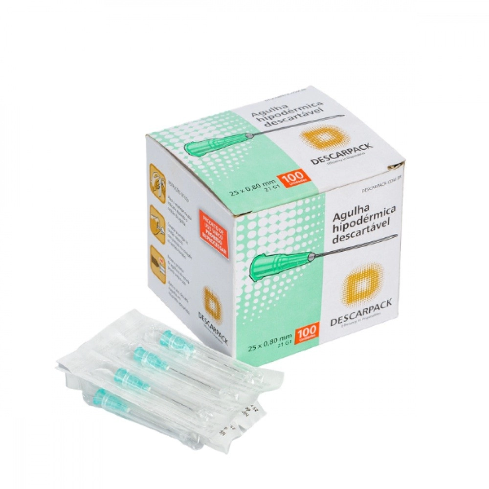 Agulha Hipodérmica Intramuscular 21G Verde 30 x 0,80mm Caixa com 100 Unidades – Descarpack