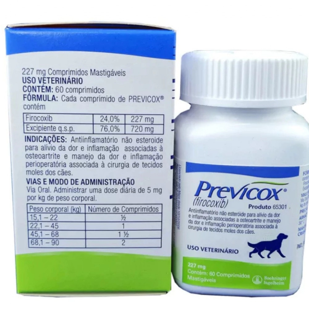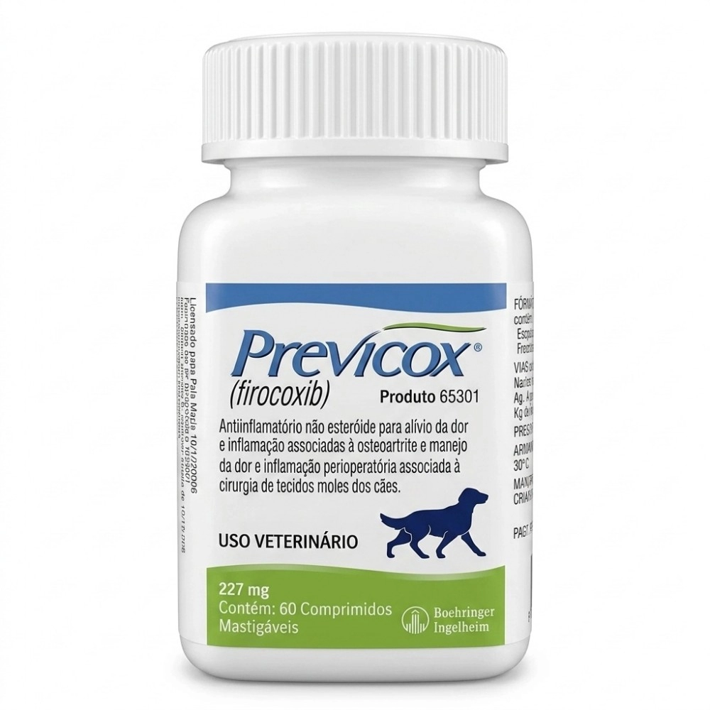O Previcox 227mg é um medicamento veterinário anti-inflamatório não esteroidal (AINE) de alta eficácia, indicado para cães, amplamente utilizado no controle da dor e inflamação, especialmente em casos de osteoartrite (doença articular degenerativa) e no pós-operatório de cirurgias ortopédicas e de tecidos moles.