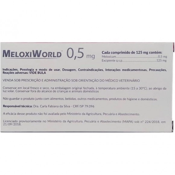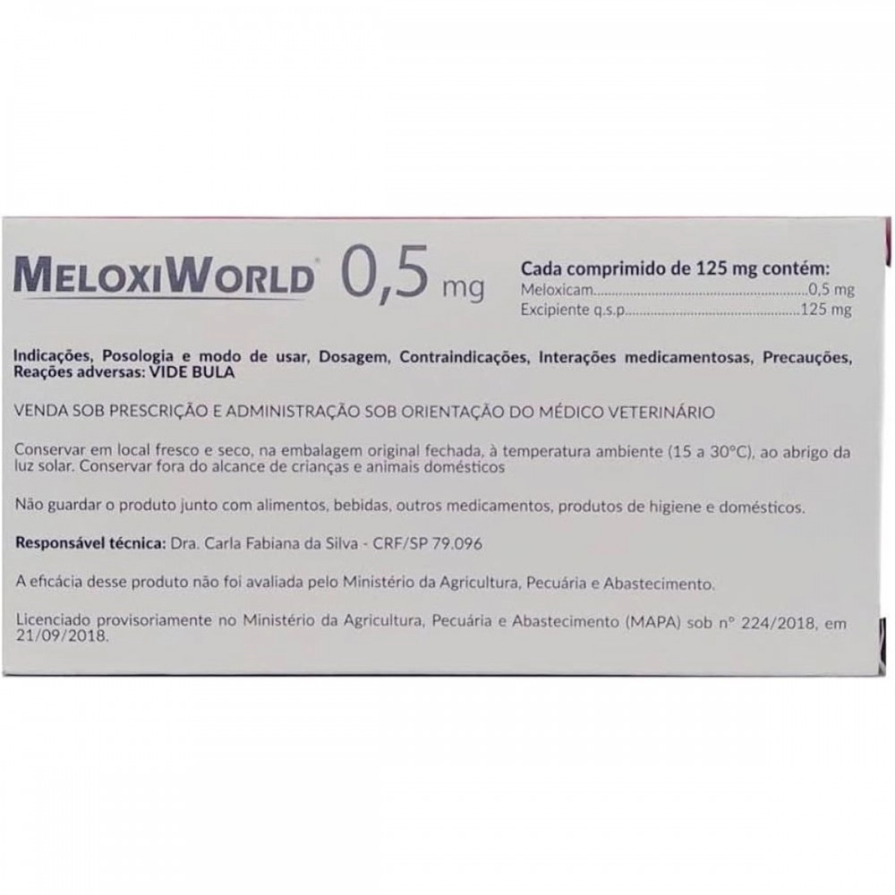 O MeloxiWorld 0,5mg World é um medicamento veterinário à base de meloxicam, indicado como anti-inflamatório não esteroidal (AINE) para auxiliar no controle da dor, inflamação e desconforto em animais, conforme orientação do médico-veterinário.