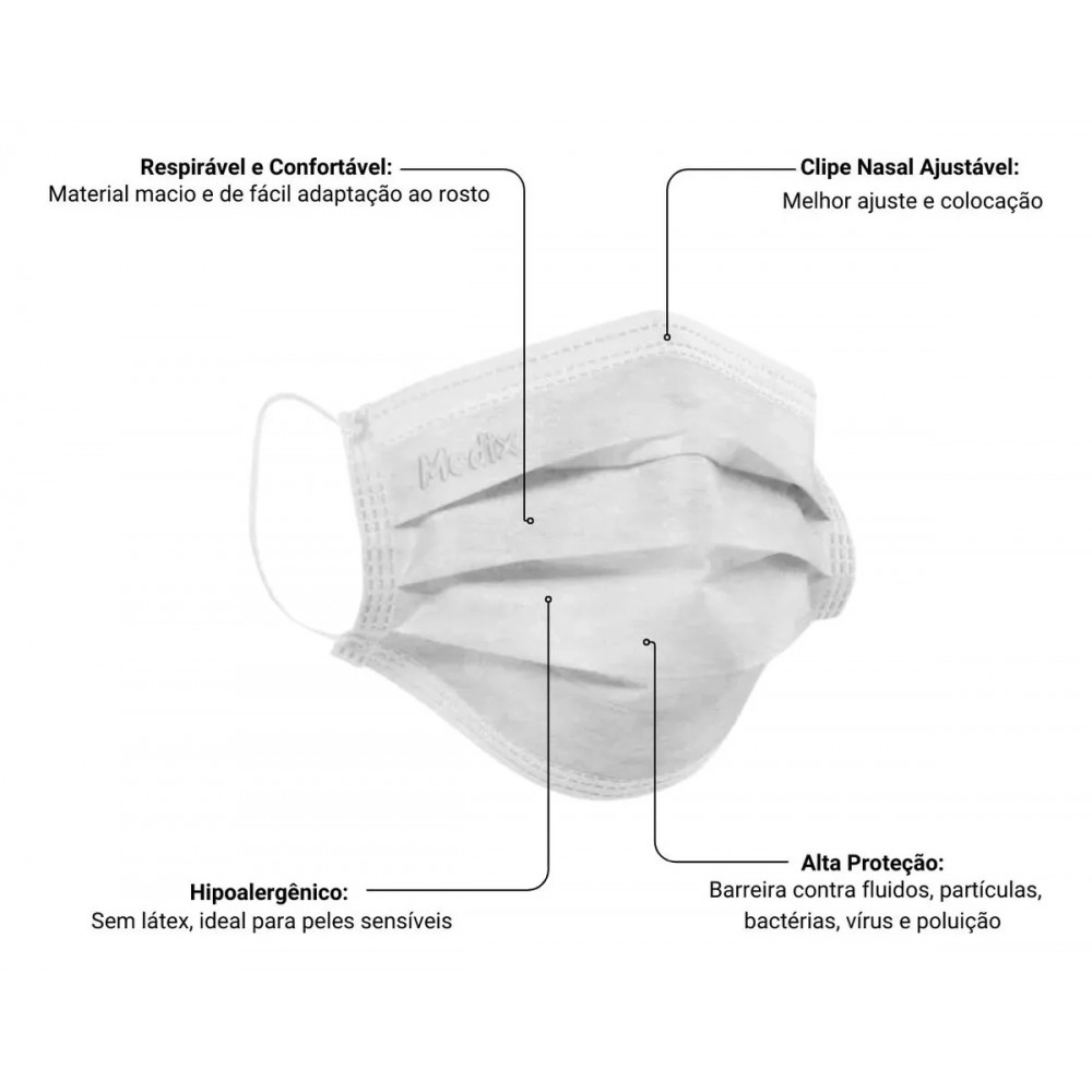 A Máscara Descartável com Elástico Tripla Camada Branca – Medix foi desenvolvida para oferecer proteção, conforto e segurança em ambientes clínicos, hospitalares, laboratoriais, estéticos e veterinários. Produzida em não tecido (TNT) de alta qualidade, possui três camadas filtrantes, garantindo maior eficiência na retenção de gotículas, partículas suspensas e respingos que possam comprometer a segurança do usuário e do paciente.