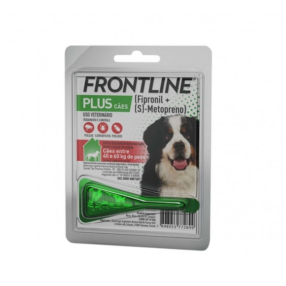 O Frontline Plus para cães de 40 a 60kg é um medicamento veterinário ectoparasiticida de alta eficácia, indicado para o controle e prevenção de pulgas, carrapatos e piolhos, oferecendo proteção completa e duradoura para cães de grande porte.
