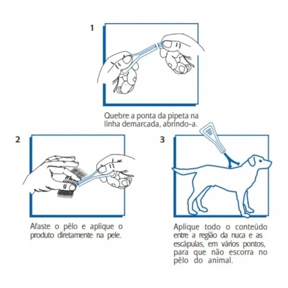 A aplicação é feita de forma tópica (spot-on), diretamente sobre a pele do cão, geralmente na região da nuca ou entre as escápulas, garantindo praticidade, segurança e eficácia. Após a aplicação, o produto se distribui pela camada lipídica da pele, proporcionando proteção contínua por várias semanas.