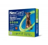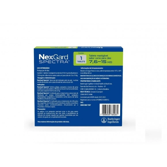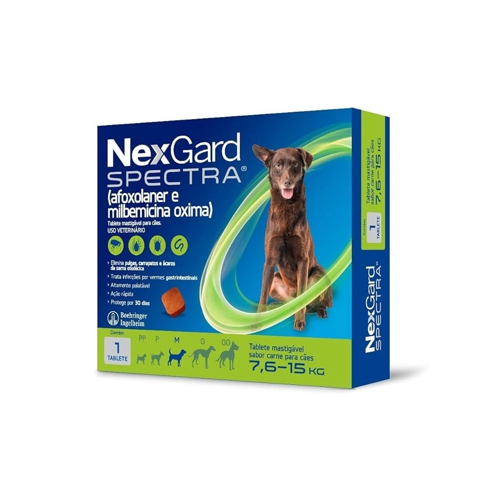 O NexGard Spectra para cães de 7,6 a 15kg é um medicamento veterinário completo, que atua como antipulgas, carrapaticida e vermífugo, oferecendo proteção ampla e eficaz contra parasitas internos e externos em um único produto.