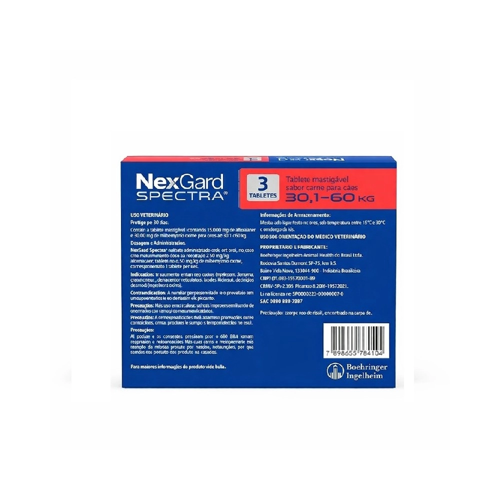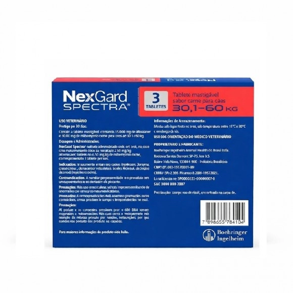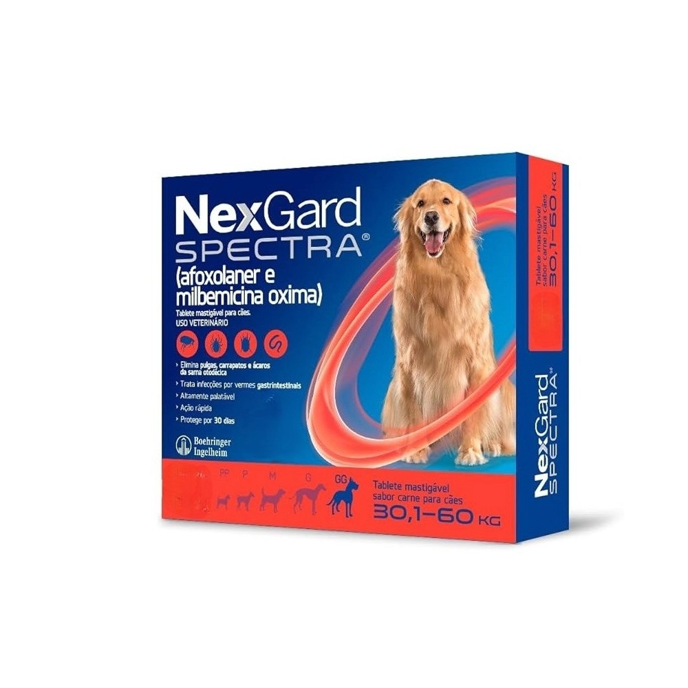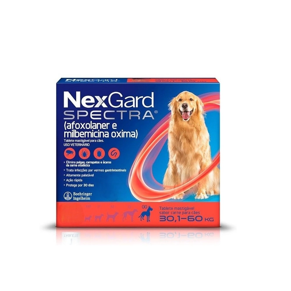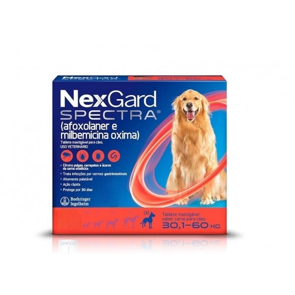 O NexGard Spectra para cães de 30,1 a 60kg é um medicamento veterinário completo, desenvolvido para oferecer proteção total contra parasitas internos e externos, atuando como antipulgas, carrapaticida e vermífugo em um único produto.