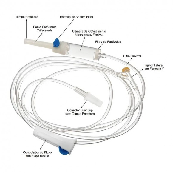 Possui câmara macrogotas, permitindo visualização clara do gotejamento, facilitando o controle da velocidade de infusão. O conector Luer Slip garante encaixe prático e rápido com dispositivos compatíveis, enquanto o tubo flexível e resistente assegura maior durabilidade e facilidade de manuseio.