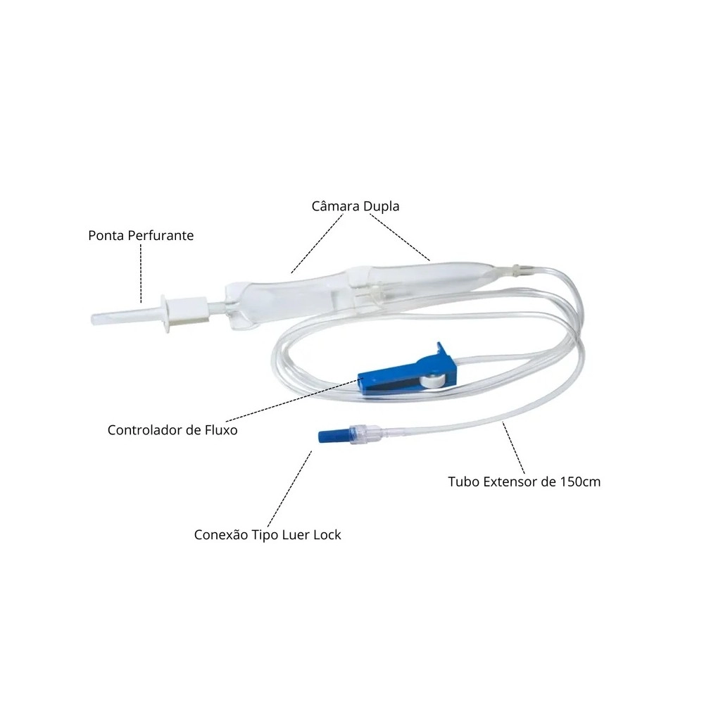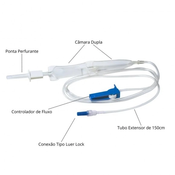 A câmara dupla permite visualização precisa do gotejamento, contribuindo para maior controle durante a transfusão. O sistema Luer Lock assegura encaixe firme, evitando vazamentos e desconexões acidentais. O equipo é estéril, descartável e de uso único, garantindo total segurança microbiológica.