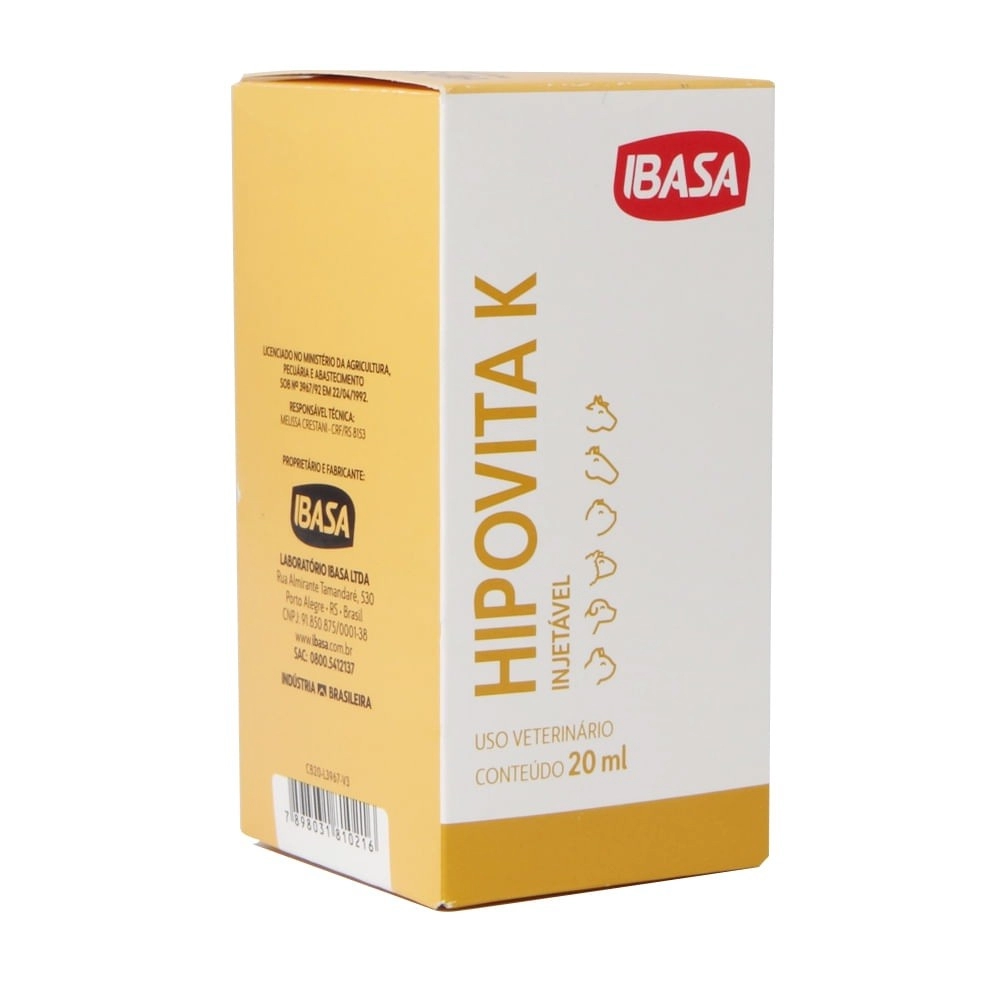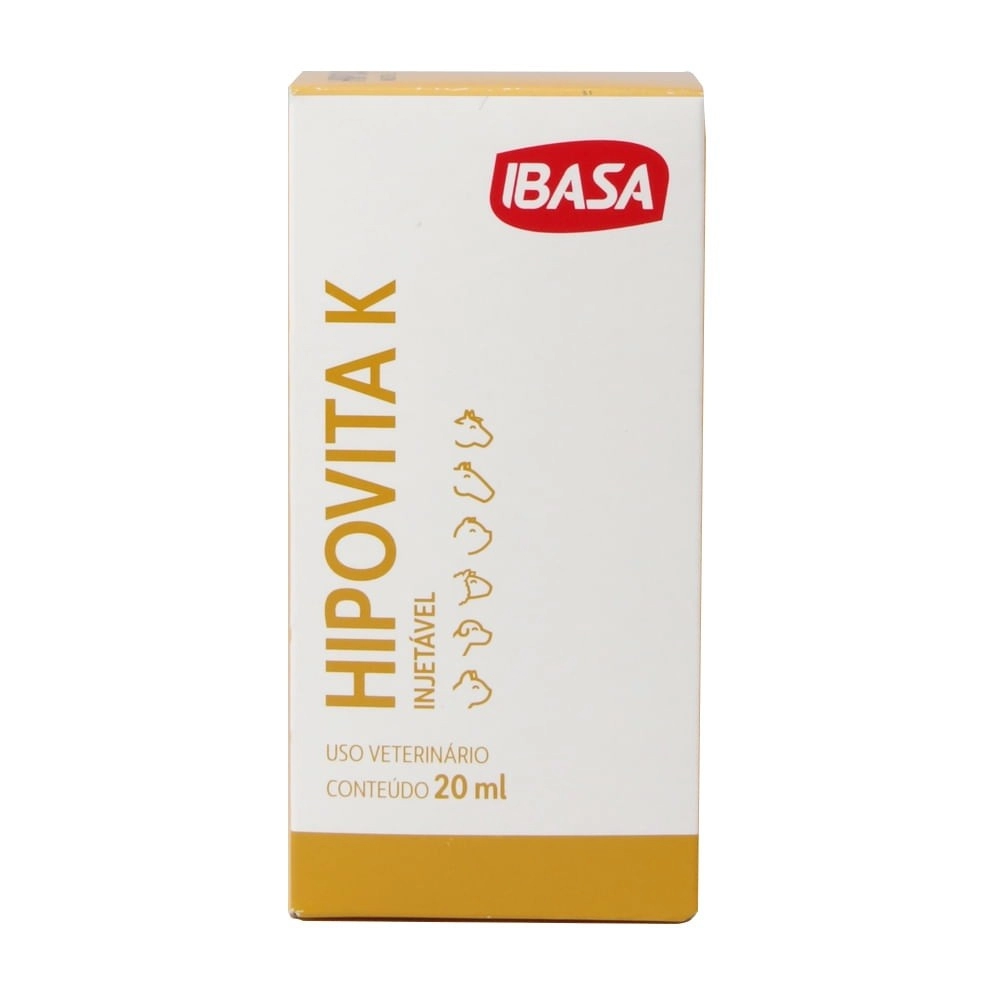 A Hipovita K 20ml Ibasa é uma vitamina K injetável veterinária desenvolvida para auxiliar na suplementação e suporte nutricional de animais, sendo indicada para bovinos, equinos e cães, sempre com orientação do médico-veterinário.