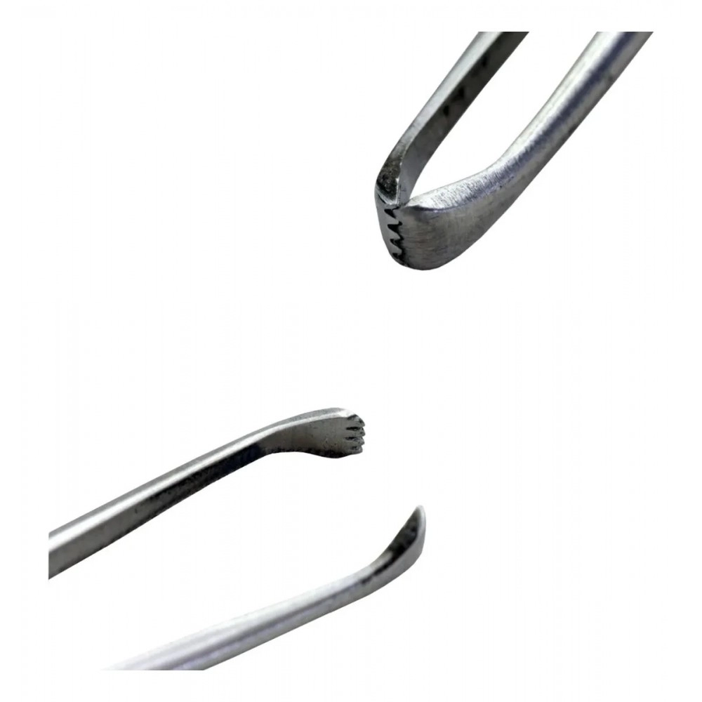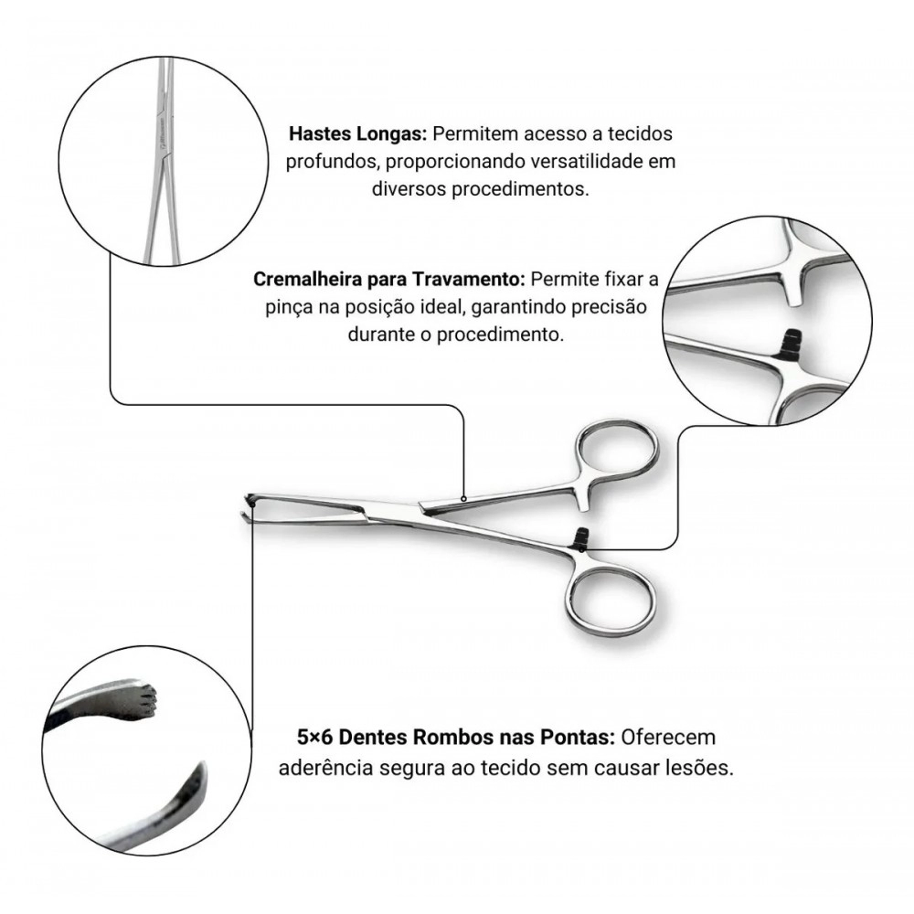 Seu design com garras dentadas proporciona aderência eficiente, permitindo segurar tecidos, estruturas e materiais sem deslizamento. É amplamente utilizada em cirurgias gerais, procedimentos ambulatoriais e rotinas clínicas, tanto na área humana quanto veterinária.