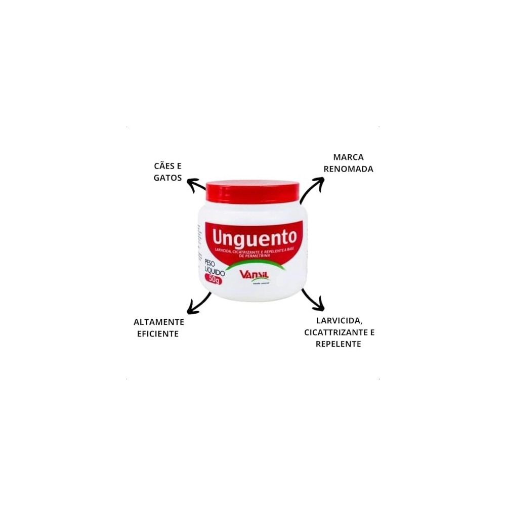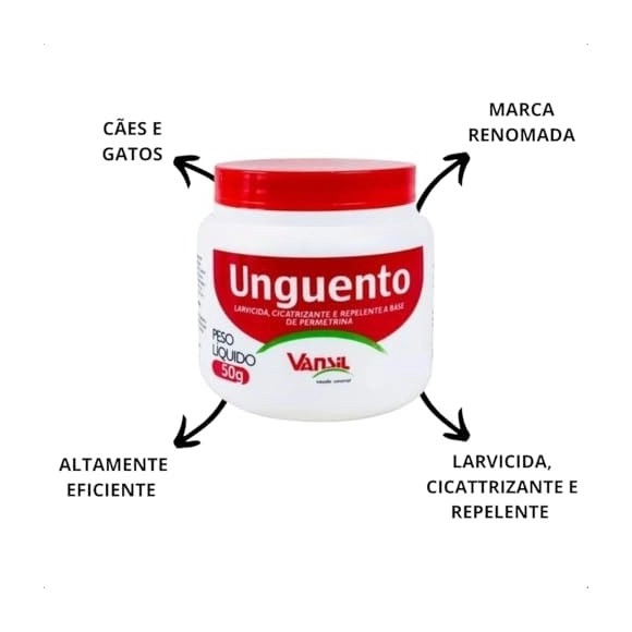 O Unguento Pomada Cicatrizante 50g - Vansil é um eficiente cicatrizante veterinário indicado para o tratamento de feridas, lesões cutâneas, rachaduras e escoriações em animais, auxiliando na proteção e recuperação da pele.