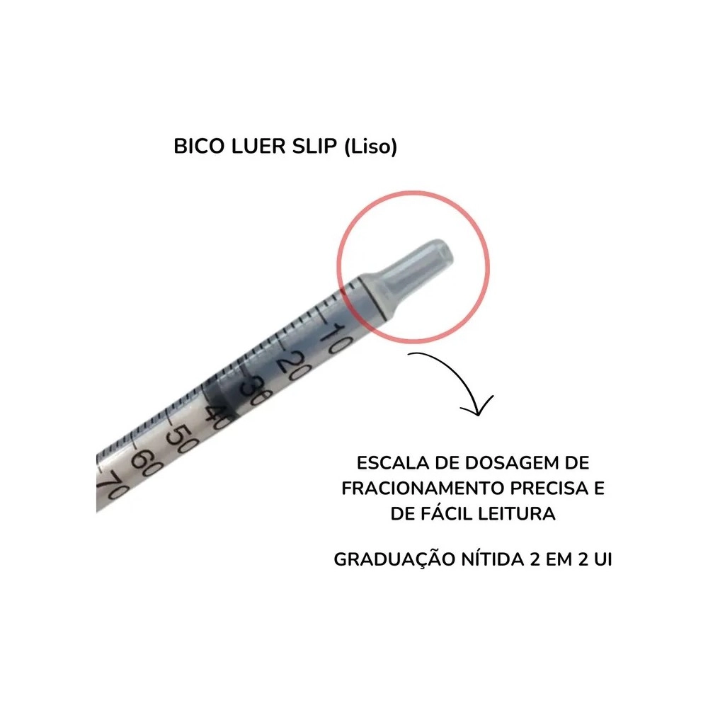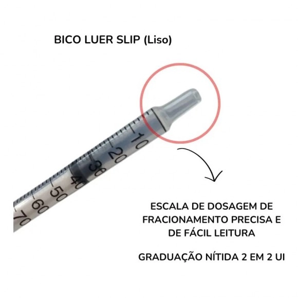 Produzida com materiais de grau médico, a seringa é transparente, permitindo visualização clara do conteúdo e facilitando o controle exato da dosagem. Seu êmbolo com anel de vedação proporciona movimento suave e preciso, enquanto o bico Luer Slip oferece encaixe fácil e rápido com qualquer tipo de agulha compatível, garantindo uso seguro e confiável.