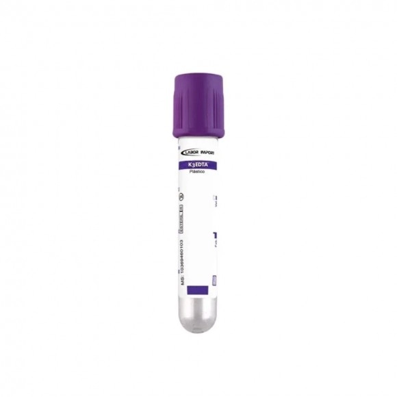 Fabricado em plástico resistente e transparente, o tubo permite visualização clara da amostra e possui tampa roxa, padrão internacional para identificação de tubos com EDTA. Sua capacidade de 4mL é ideal para coletas precisas, assegurando o volume correto de amostra e a proporção adequada entre sangue e anticoagulante.