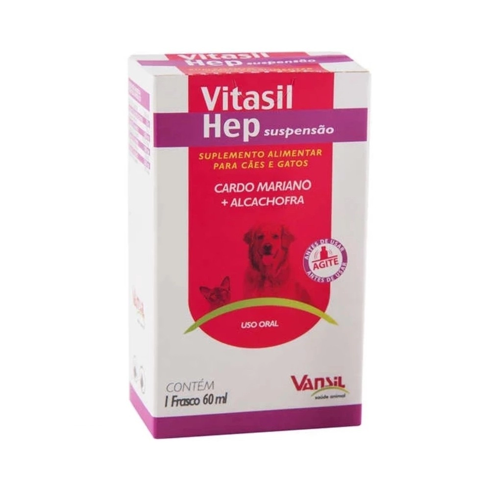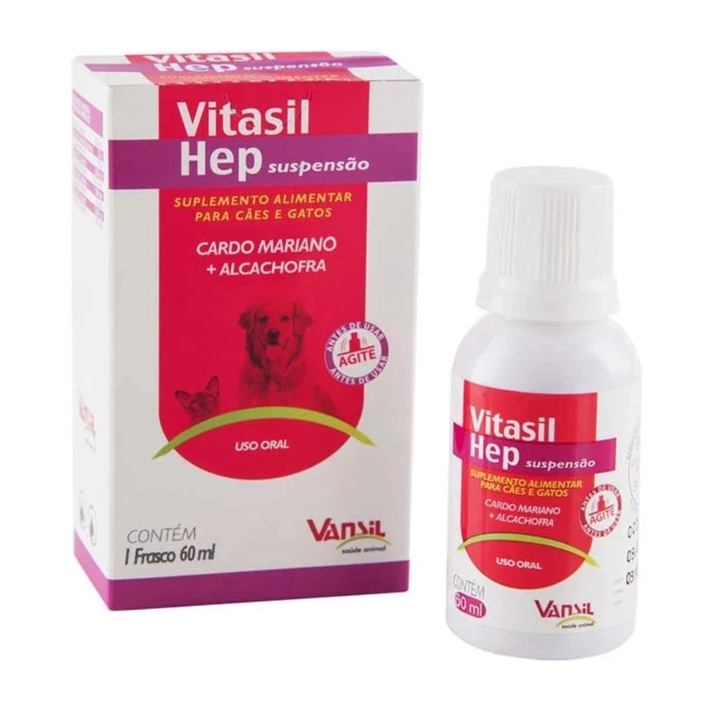O Vitasil Hep Suspensão 60mL é um suplemento alimentar veterinário indicado para cães e gatos, formulado para auxiliar no suporte hepático e na manutenção da saúde do fígado dos pets.